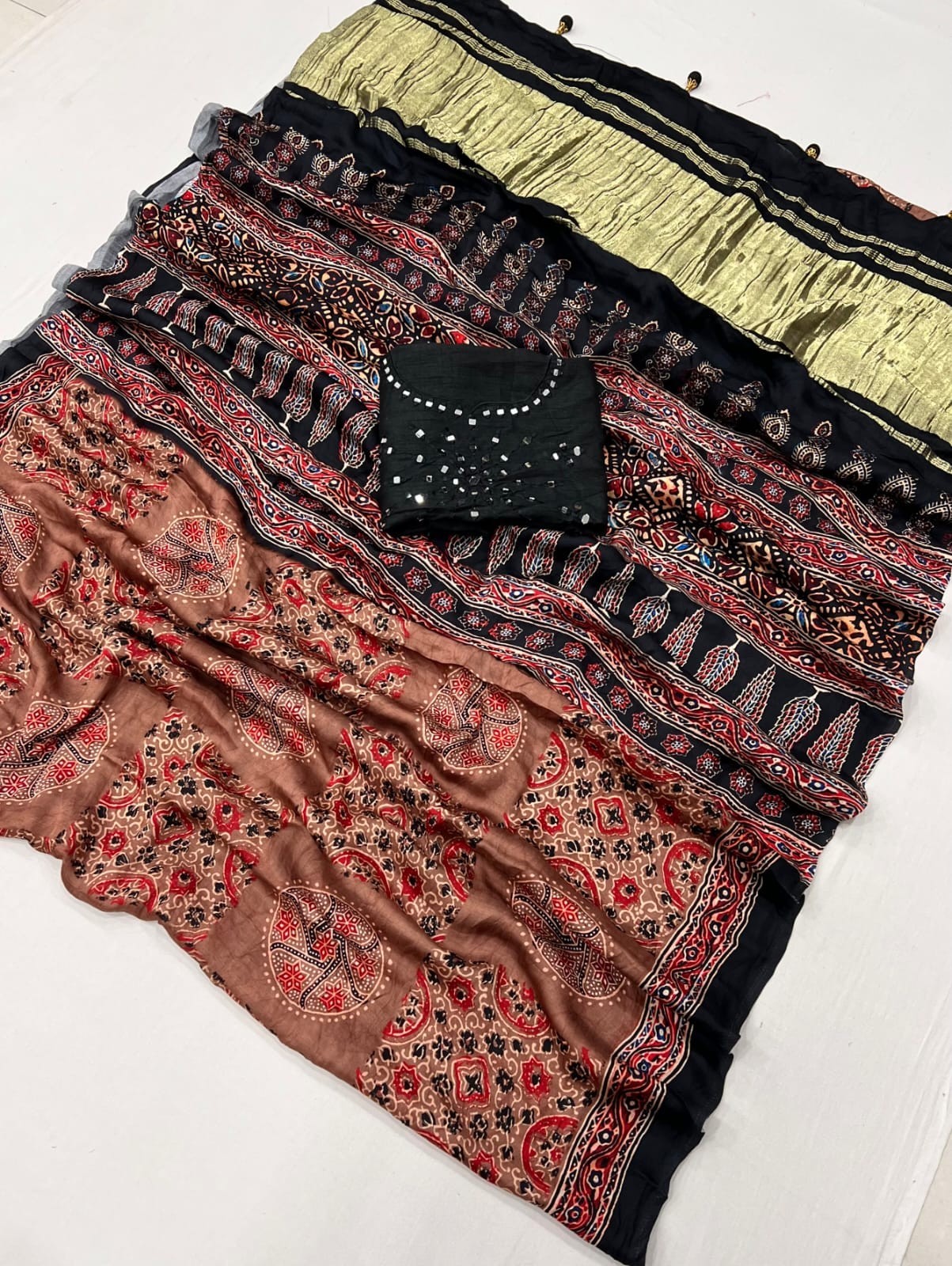 Black Ajrakh Print Viscose Gajji Lagdi Patta Saree For Women, Mirror W