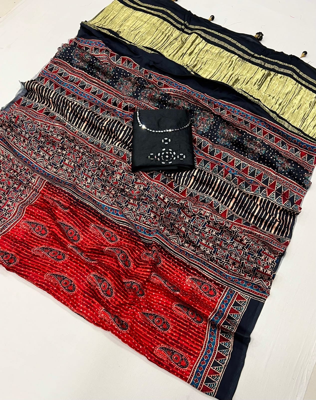 Elevate your ethnic wardrobe with this Black Ajrakh Print Viscose Gajji Lagdi Patta Saree, expertly crafted for women. Featuring traditional Ajrakh motifs on soft, breathable viscose fabric, this saree offers comfort and cultural elegance. The gajji lagdi patta design adds a refined touch, while exquisite mirror work enhances its visual appeal, making it ideal for festive occasions or formal gatherings. Perfectly balancing heritage and style, this saree promises both grace and durability.